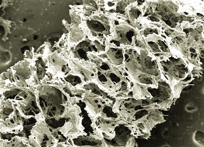 扫描电子显微镜拍摄的丝蛋白支架的海绵状多孔结构。